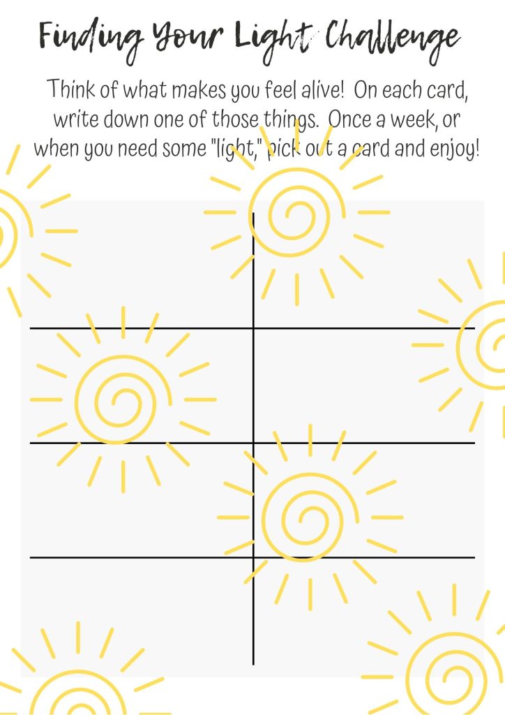 Think of the things that make you feel fully alive: getting lost in a new book, taking a hike, enjoying a yummy smoothie, trying a new recipe…you get the idea. Now write those things down – I even created a fun printable for you below – and put them in a jar, basket, or envelope. Once a week, or when you need some light, pick one out and do it. Do it for you, do it because it makes you feel happy, and enjoy every minute of it. This is your chance to shine!