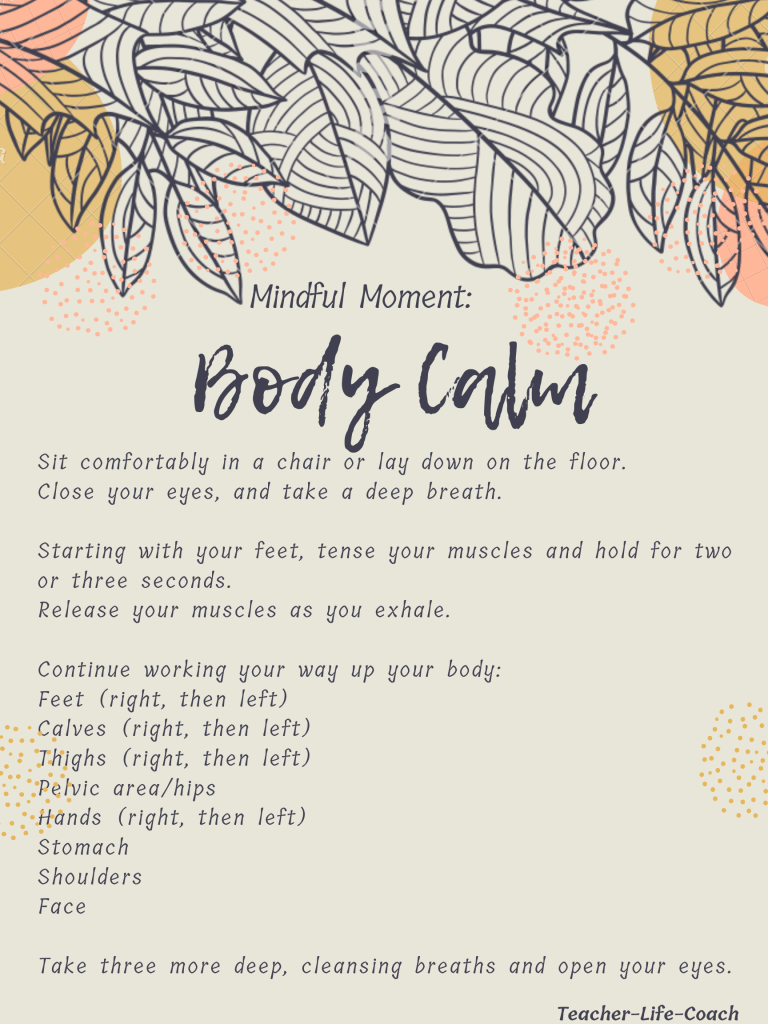 Hi friends! Raise your hand if your body has ever felt stressed. Yep, I am with you! Sometimes…okay, a lot of the time…we carry stress in our muscles, and our bodies pay the price. So, here is a quick activity to help you release the tension in your body and find your way to calm.