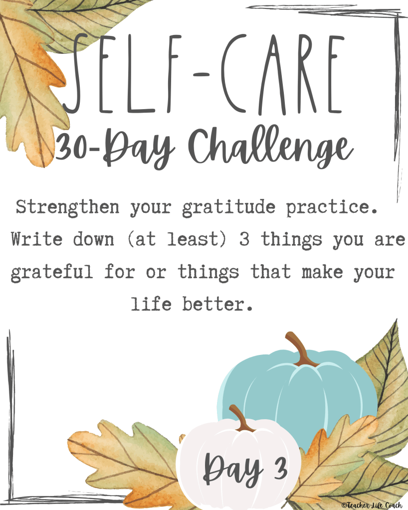Today we will focus on strengthening our gratitude. “How is that self-care,” you might ask. Well, it is proven that we can rewire our brains to be happy by simply recalling three things we are grateful for every day for 21 days. And when our brain is happy, our body is happy and our soul is happy.